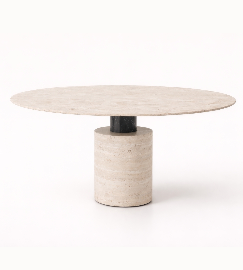 ORIS traverten yemek masası, doğal taşın özgün dokusunu ve zamansız karakterini ön plana çıkaran el yapımı bir tasarımdır. Gerçek travertenden üretilen bu masa, her parçada farklılaşan damar yapısıyla yaşam alanlarına sakin ve güçlü bir mimari etki kazandırır.