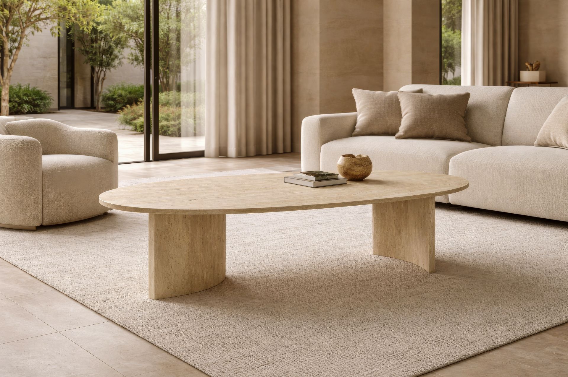 Oval traverten orta sehpa formu, oturma alanlarında dolaşımı rahatlatır ve salon düzenine organik bir akış kazandırır. İki sütun ayaklı taşıyıcı yapı, masaya mimari bir denge sağlarken görsel ağırlığı sade bir kompozisyon içinde tutar.