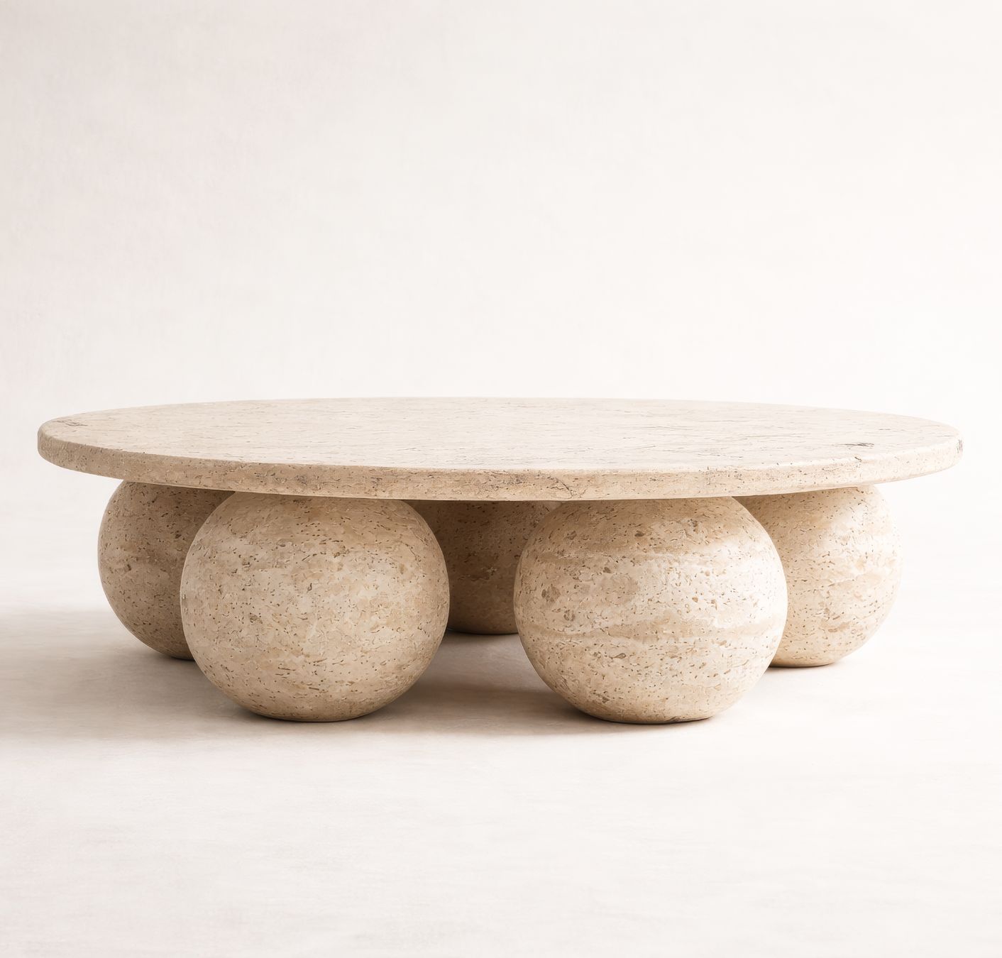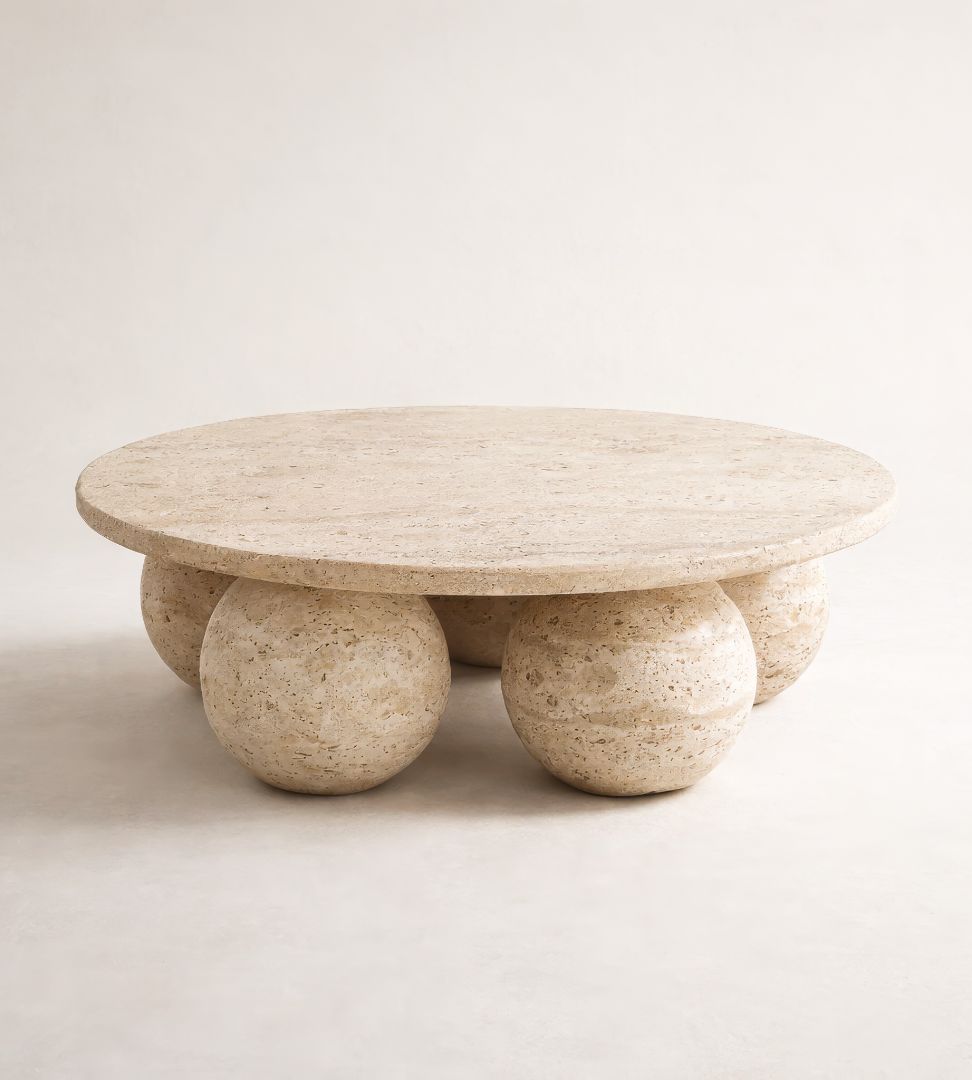 LUNEA Yuvarlak Traverten Orta Sehpa, doğal traverten taşının yalın gücünü sakin ve dengeli bir tasarım anlayışıyla bir araya getirir. %100 doğal taştan üretilen bu orta sehpa, yuvarlak formu ve küresel ayak yapısıyla mekânda yumuşak bir akış ve görsel denge yaratır.